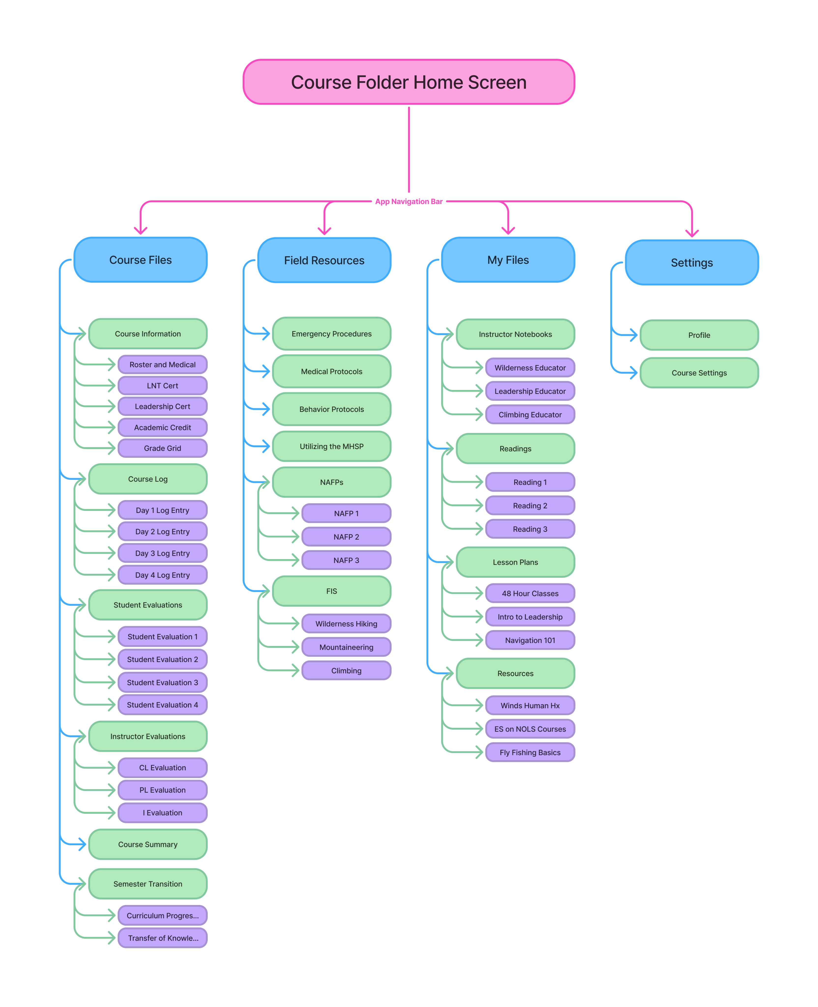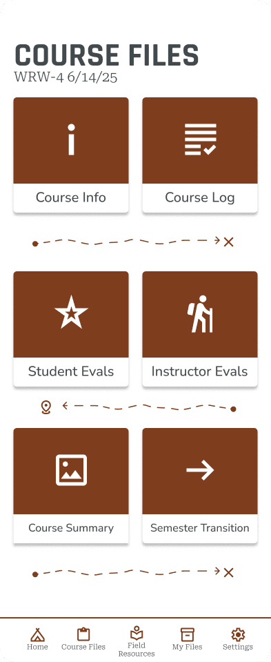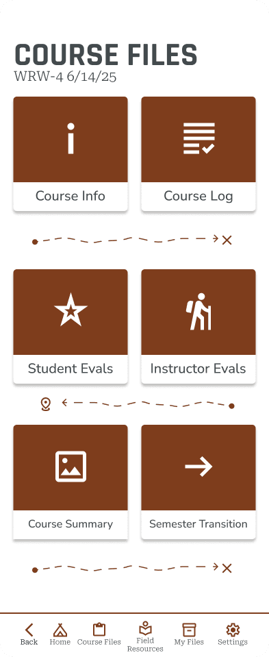 The site map echoed current instructor systems for organizing paperwork with Course Files holding forms for documentation that instructors interact with more readily, while Field Resources and My Files hold different types of reference documents used for risk and course management and teaching.